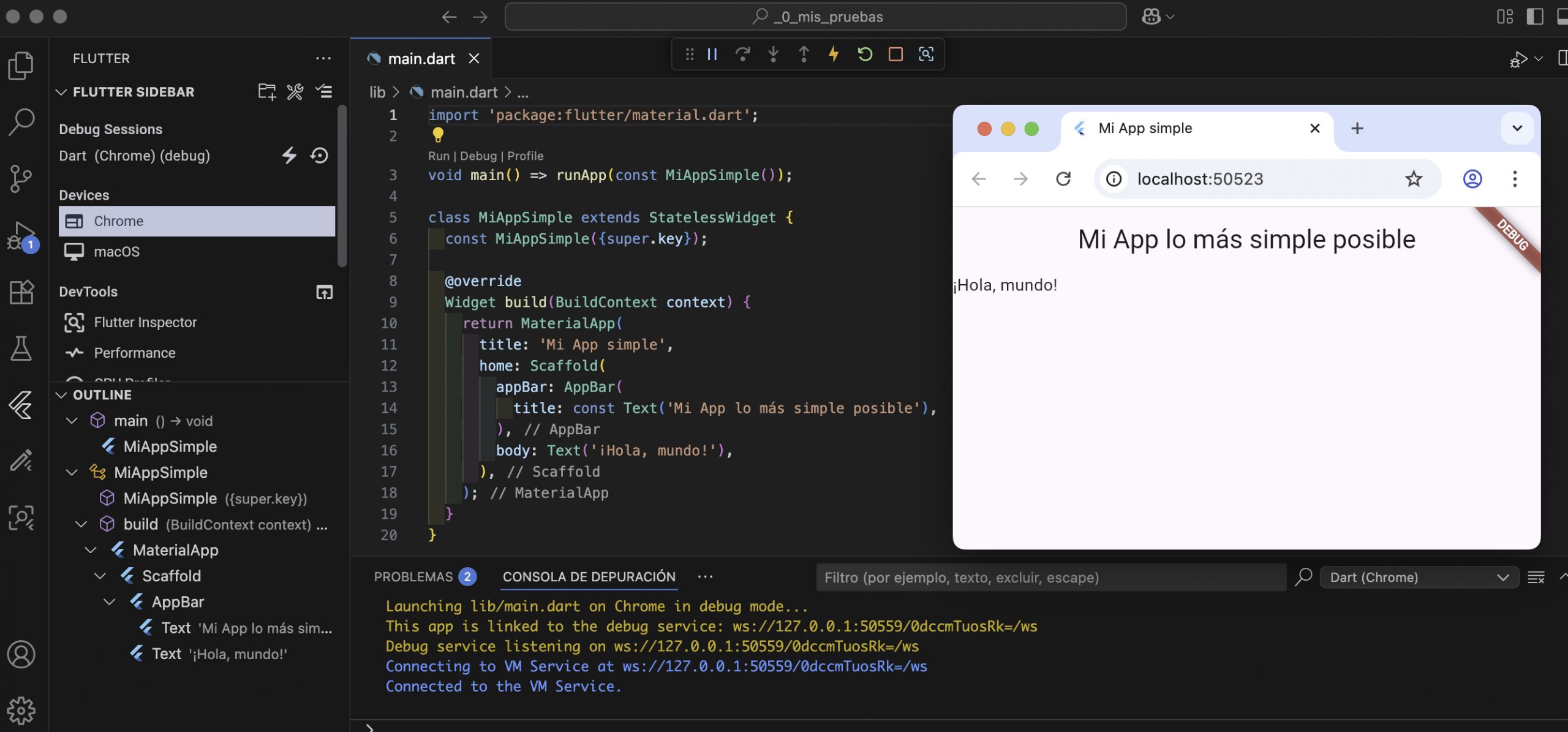 Scaffold(estructura visual da pantalla) está incluído dentro do mesmo widget que se lle pasa arunApp()(MiAppSimple). É unha estrutura sinxela, útil para probar rapidamente que todo funciona, pero non é recomendable para apps reais, xa que non separa a lóxica de configuración e a lóxica visual. - No exemplo anterior,