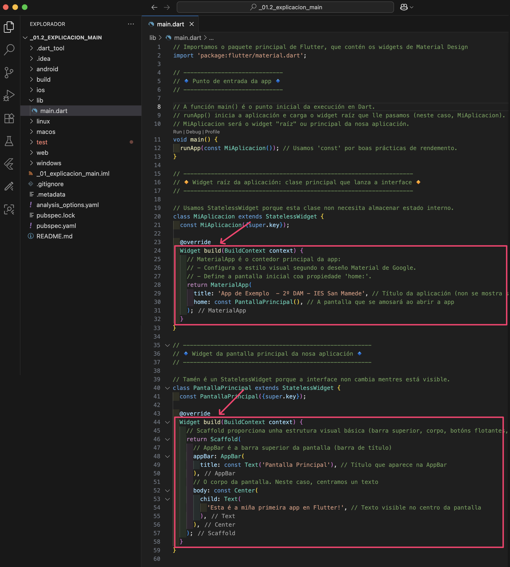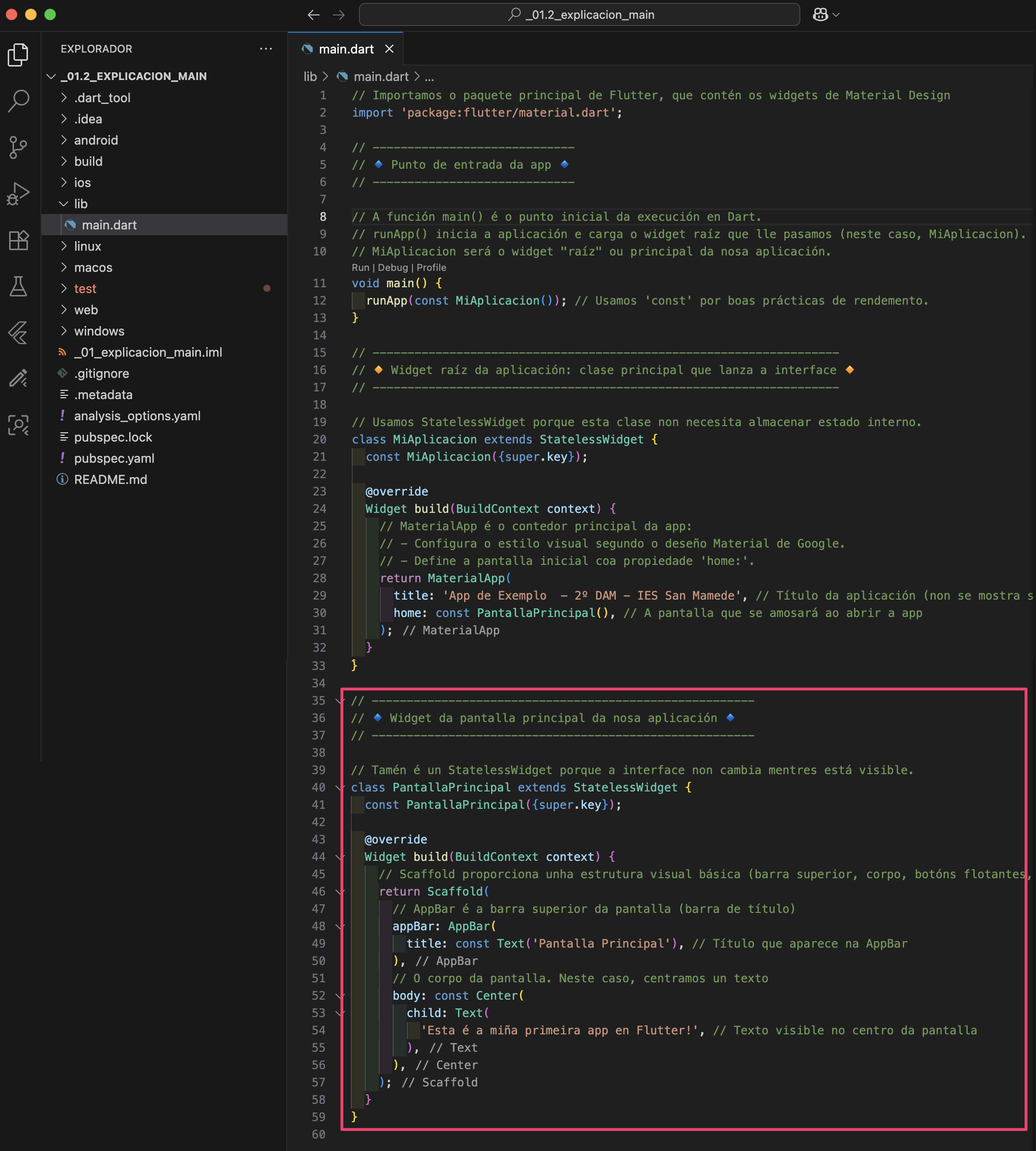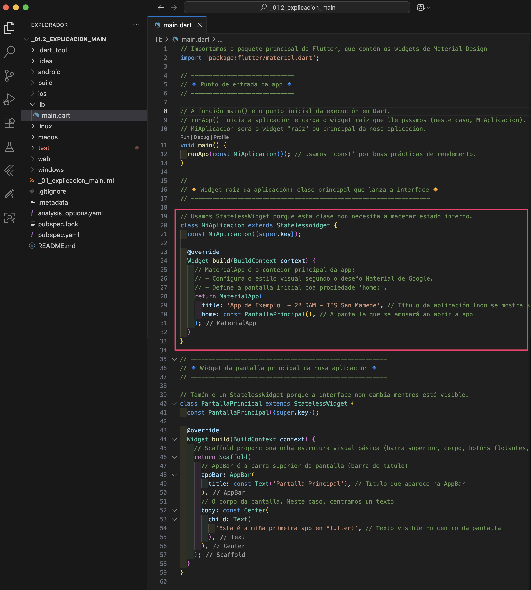 runApp()chama a un widget raíz chamadoMiAplicacion, e este non contén directamente a interface visual, senón que define un MaterialApp e delega a visualización real a outro widget:PantallaPrincipal. - A diferenza do exemplo anterior, non se emprega