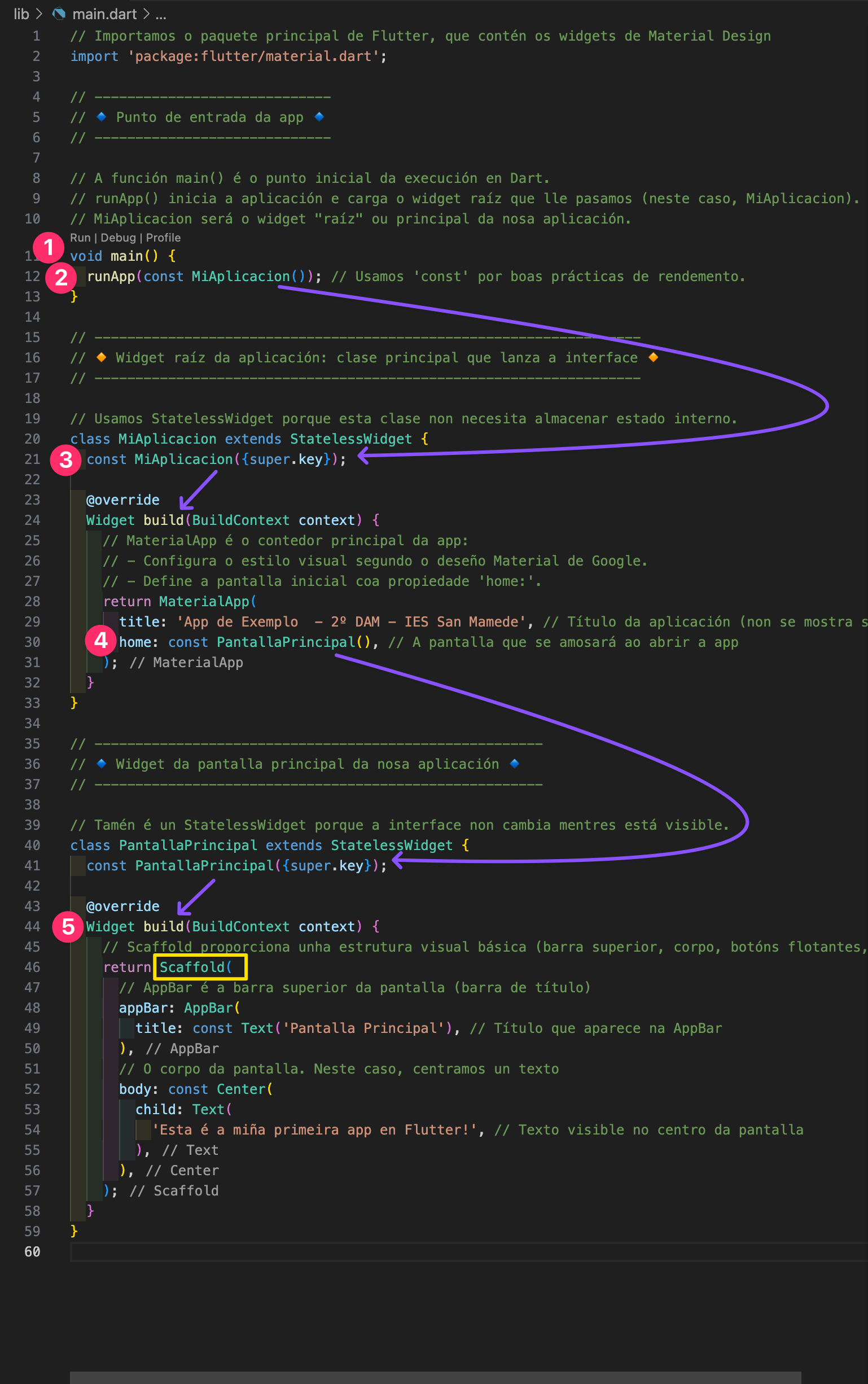 void main()é a función principal que se executa ao lanzar a app.runApp(...)é unha función de Flutter que inicia a aplicación. É o que lle di ao sistema operativo: “comeza a construír a interface da app usando este widget”.MiAplicacion, chamado así neste exemplo, é o primeiro widget que se constrúe.
