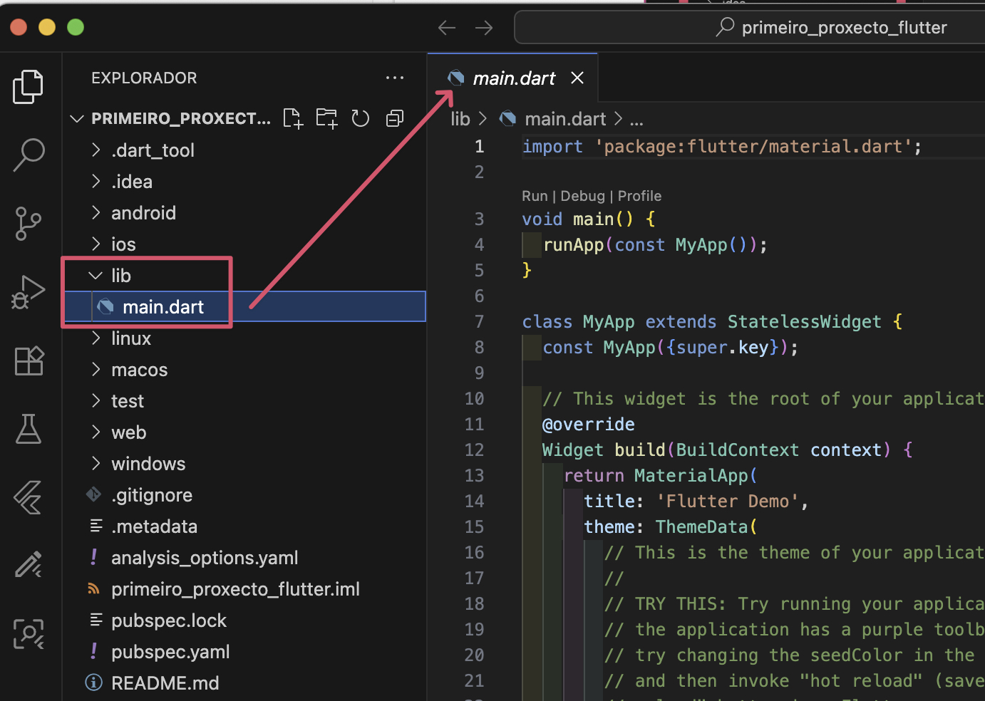 O ficheiro lib/main.dart é o primeiro lugar onde o código comeza a executarse cando se inicia a aplicación.
