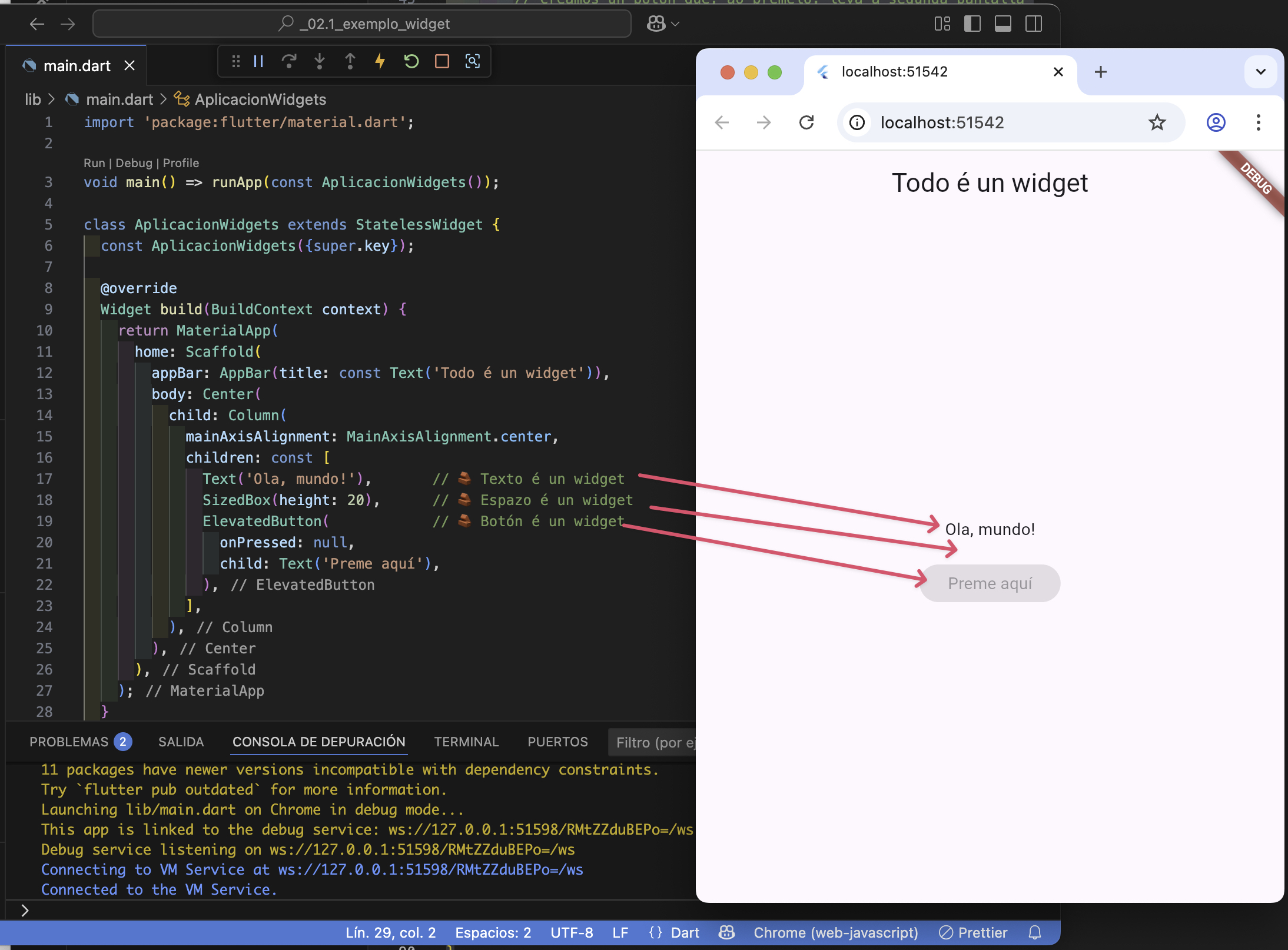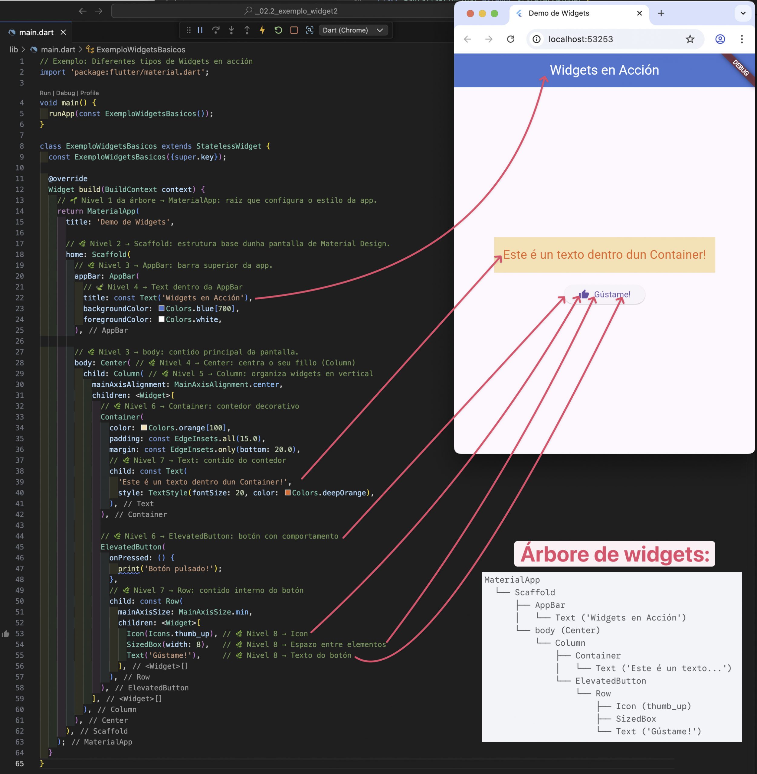 📌 Cada widget que aparece no código forma parte dunha árbore de widgets. Esta estrutura permítelle a Flutter saber como construír e actualizar a interface de forma eficiente.