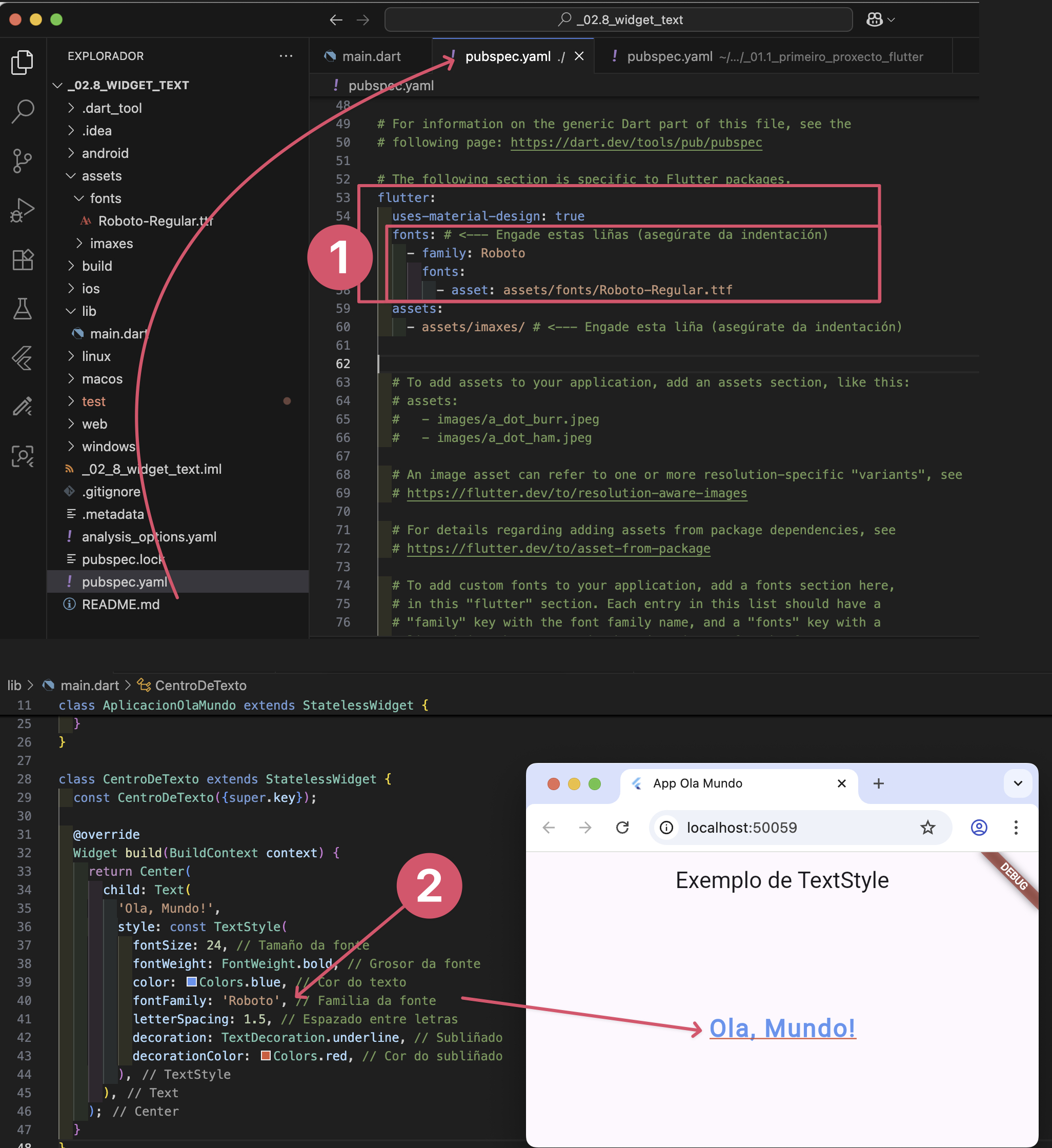Para usar unha familia de fonte personalizada, debes declarala en pubspec.yaml e incluír os arquivos .ttf no cartafol do proxecto (assets/fonts).