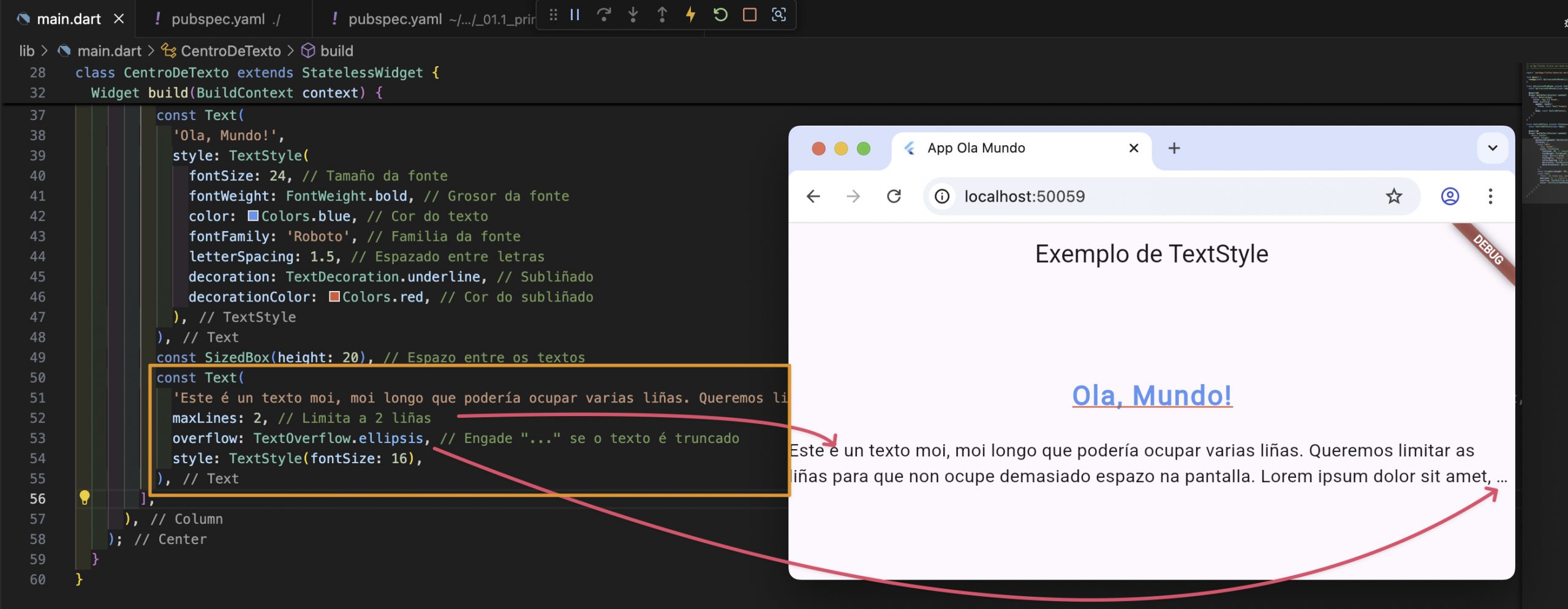 Para limitar o número de liñas que pode ocupar o texto, utiliza a propiedade maxLines. Se o texto excede este límite, truncarase. Podes especificar como se truncará o texto coa propiedade overflow.