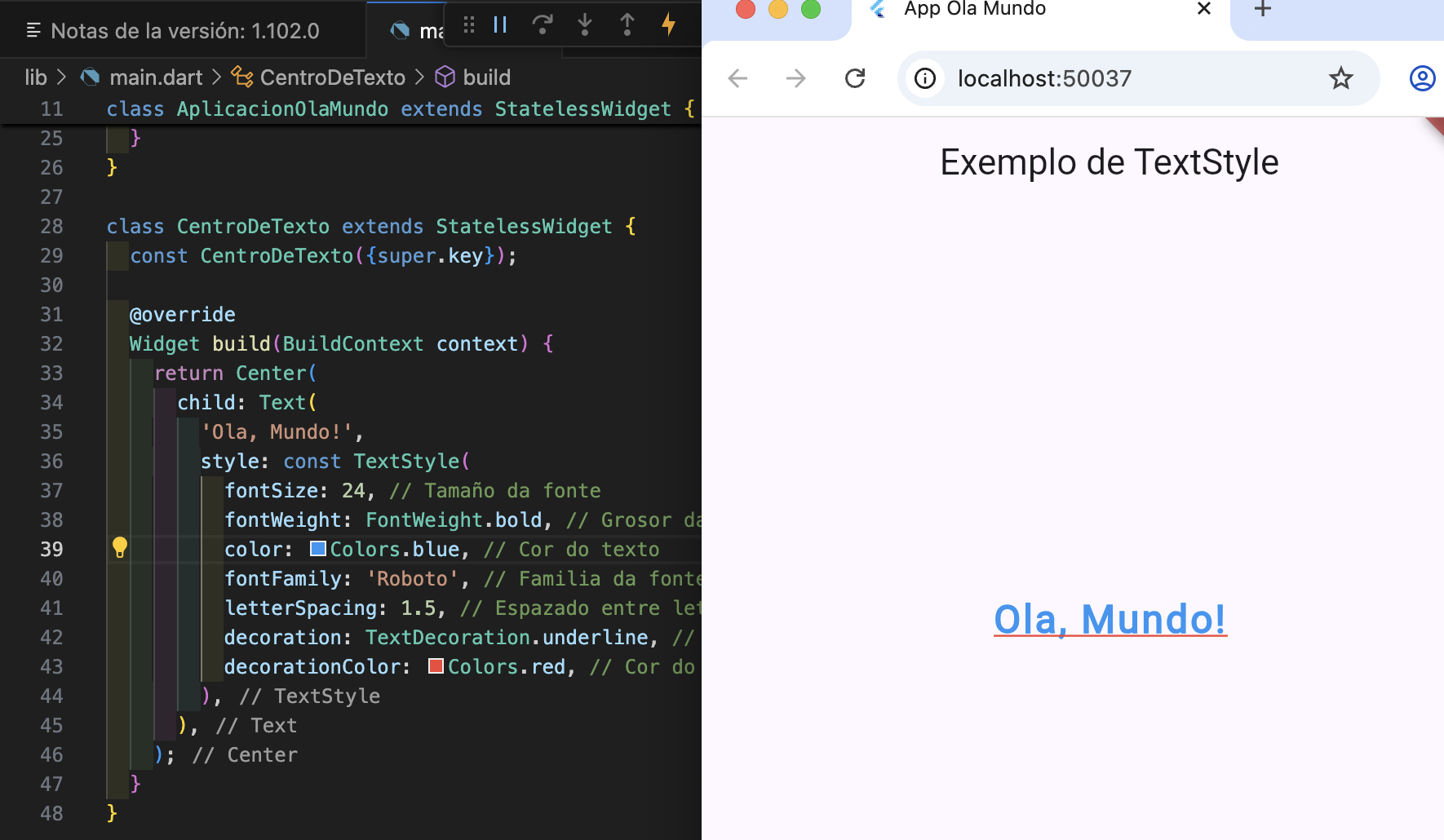 Podes personalizar a aparencia do texto en Flutter mediante a propiedade style, que acepta un obxecto TextStyle.
